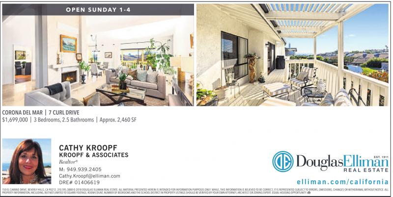 OPEN SUNDAY 1-4 CORONA DEL MAR | 7 CURL DRIVE $1,699,000 | 3 Bedrooms, 2.5 Bathrooms | Approx.2,460 SF CATHY KROOPF KROOPF & ASSOCIATES Realtor ® M: 949.939.2405 Cathy.Kroopf@elliman.com DRE# 01406619 elliman.com/california 150ELCAMINO DRIVE,BEVERLY HILLS,CA90212.310.595.3888 ©2018DOUGLASELLIMAN REAL ESTATE. ALL MATERIAL PRESENTEDHEREINISINTENDED FOR INFORMATIONPURPOSESONLY. WHILE, THIS INFORMATION IS BELIEVED TO BE CORRECT,ITISREPRESENTED SUBJECTTOERRORS,OMISSIONS,CHANGESORWITHDRAWALWITHOUTNOTICE. ALL PROPERTYINFORMATION,INCLUDING,BUT NOTLIMITEDTOSQUAREFOOTAGE, ROOM COUNT, NUMBEROFBEDROOMSAND THESCHOOL DISTRICTINPROPERTYLISTINGS SHOULDBEVERIFIEDBYYOUR OWNATTORNEY, ARCHITECTOR ZONING EXPERT.EQUAL HOUSING OPPORTUNITY. See also