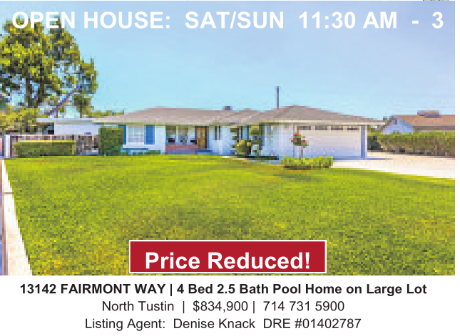 13142 FAIRMONT WAY |4Bed 2.5 Bath Pool Home onLarge Lot North Tustin | $834,900 | 714 731 5900 Listing Agent: Denise Knack DRE #01402787