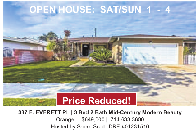337 E. EVERETT PL |3Bed 2Bath Mid-Century Modern Beauty Orange | $649,000 | 714 633 3600 Hosted by Sherri Scott DRE #01231516