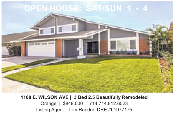 1108 E.WILSON AVE | 3 Bed 2.5 Beautifully Remodeled Orange | $849,000 | 714 714.812.6523 Listing Agent: Tom Render DRE #01977175