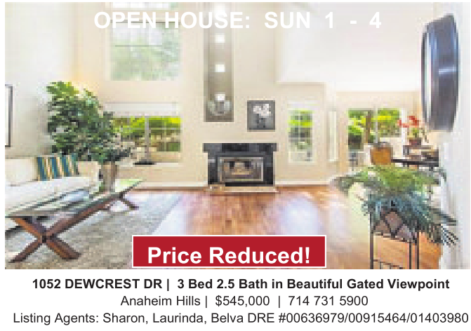 1052 DEWCREST DR | 3 Bed 2.5 Bath in Beautiful Gated Viewpoint Anaheim Hills | $545,000 | 714 731 5900 Listing Agents: Sharon, Laurinda, Belva DRE #00636979/00915464/01403980