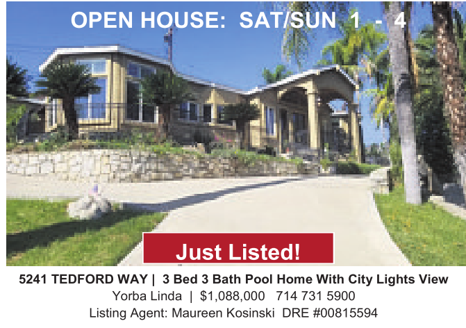 5241 TEDFORD WAY | 3Bed 3Bath Pool Home With City Lights View Yorba Linda | $1,088,000 714 731 5900 Listing Agent: Maureen Kosinski DRE #00815594