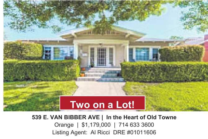 539 E.VAN BIBBER AVE | Inthe Heart ofOld Towne Orange | $1,179,000 | 714 633 3600 Listing Agent: AlRicci DRE #01011606