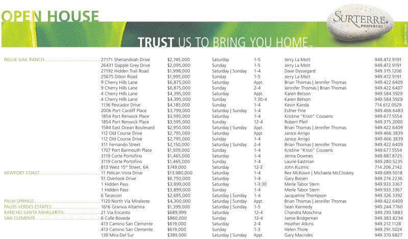 NELLIE GAIL RANCH............................................ 27171 Shenandoah Drive $2,745,000 Saturday 1-5 Jerry La Mott 949.472.9191 26431 Dapple Grey Drive $2,095,000 Sunday 1-5 Jerry La Mott 949.472.9191 27192 Hidden Trail Road $1,998,000 Saturday | Sunday 1-4 Dave Dyssegard 949.315.1206 25675 Dillon Road $1,995,000 Sunday 1-5 Jerry La Mott 949.472.9191 9 Cherry Hills Lane $6,875,000 Saturday Appt. Brian Thomas | Jennifer Thomas 949.422.6409 9 Cherry Hills Lane $6,875,000 Sunday 2-4 Jennifer Thomas | Brian Thomas 949.422.6407 4 Cherry Hills Lane $4,395,000 Saturday Appt. Karen Betson 949.584.5929 4 Cherry Hills Lane $4,395,000 Sunday 1:30-4 Karen Betson 949.584.5929 1136 Pescador Drive $4,185,000 Sunday 1-4 Kevin Kanda 714.612.0529 2006 Port Cardiff Place $3,799,000 Saturday | Sunday 1-4 Esther Fine 949.466.6483 1854 Port Renwick Place $3,595,000 Saturday 1-4 Kristine "Kristi" Cousens 949.677.5554 1854 Port Renwick Place $3,595,000 Sunday 12-4 Robert Pfeif 949.375.2000 1584 East Ocean Boulevard $2,950,000 Saturday | Sunday Appt. Brian Thomas | Jennifer Thomas 949.422.6409 112 Old Course Drive $2,795,000 Saturday Appt. Janice Arrigo 949.466.3839 112 Old Course Drive $2,795,000 Sunday 1-4 Janice Arrigo 949.466.3839 311 Fernando Street $2,150,000 Saturday | Sunday 2-4 Brian Thomas | Jennifer Thomas 949.422.6409 1707 Port Barmouth Place $1,939,000 Sunday 1-4 Kristine "Kristi" Cousens 949.677.5554 3119 Corte Portofino $1,465,000 Saturday 1-4 Jenna Downes 949.887.8725 3119 Corte Portofino $1,465,000 Sunday 1-4 Laurie Eastman 949.280.5235 813 West 15 th Street, 6A $749,000 Saturday 12-3 John Kuzmic 714.206.2142 NEWPORT COAST............................................... 11 Pelican Vista Drive $13,980,000 Saturday 1-4 Rex McKown | Michaela McCloskey 949.689.5018 51 Overlook Drive $6,750,000 Saturday 1-4 Gary Boisen 949.274.2236 1 Hidden Pass $3,899,000 Saturday 1-3:30 Merle Tabor Stern 949.933.3367 1 Hidden Pass $3,899,000 Sunday 1-4 Merle Tabor Stern 949.933.3367 6 Tarascon $2,695,000 Saturday | Sunday 1-4 Jacqueline Thompson 949.326.3392 PALM SPRINGS.................................................... 1120 North Via Miraleste $4,300,000 Saturday | Sunday Appt. Brian Thomas | Jennifer Thomas 949.422.6409 PALOS VERDES ESTATES...................................... 1616 Granvia Altamira $1,399,000 Saturday | Sunday 1-5 Sean Kennedy 949.244.7760 RANCHO SANTA MARGARITA ............................ 21 Via Encanto $689,999 Saturday 12-4 Chandra Moschina 949.293.5883 SAN CLEMENTE................................................... 6 Calle Boveda $860,000 Sunday 12-4 Jamie Bridgeman 949.383.8234 413 Camino San Clemente $619,000 Saturday 2-4 Heather Atkins 949.212.1128 413 Camino San Clemente $619,000 Sunday 1-3 Helen Thole 949.291.5024 130 Mira Del Sur $389,000 Saturday | Sunday Appt. Gary Macrides 949.370.6827