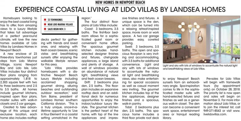 Pre-sales for Lido Villas will begin with framewalk tours (by appointment only) on October 28, 2018. The priority list is now open and sales will begin on November 3. For more information about Lido Villas,or to join the interest list, call 949-371-8543 or visit www. livelidovillas.com.