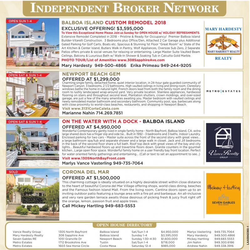 Vance Realty Group 1305 North Bayfront Balboa Island Sat/Sun 1-4 $4,950,000 Marlys Vasterling 949.735.7064 Mary Hardesty Realty 308 Sapphire Ave Balboa Island Sunday 1-4 $3,595,000 Mary Hardesty 949.500.4866 Seven Gables RE 1051 Granville Dr Newport Beach Sunday 1:30-4:30 $1,600,000 Mickey Hartling 949.683.5553 Metro Estates 1712 Brookshire Ave Tustin Sat/Sun 1-4 $718,000 Jim Nahin 949.300.6186 Metro Estates 1603 Sea Horse Circle Costa Mesa Saturday 12-4 $985,000 Andrew Nahin 949.338.3916