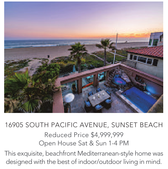16905 SOUTH PACIFIC AVENUE, SUNSET BEACH Reduced Price $4,999,999 Open House Sat & Sun 1-4 PM This exquisite, beachfront Mediterranean-style home was designed with the best of indoor/outdoor living in mind.