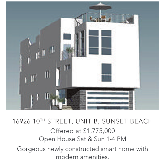16926 10 TH STREET, UNIT B, SUNSET BEACH Offered at $1,775,000 Open House Sat & Sun 1-4 PM Gorgeous newly constructed smart home with modern amenities.