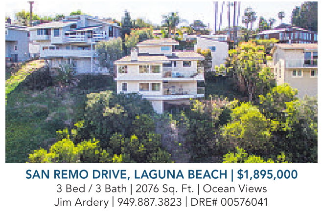 SAN REMO DRIVE, LAGUNA BEACH | $1,895,000 3 Bed / 3 Bath | 2076 Sq. Ft. | Ocean Views Jim Ardery | 949.887.3823 | DRE# 00576041