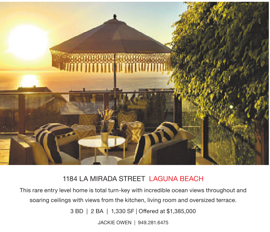 1184 LA MIRADA STREET LAGUNA BEACH This rare entry level home istotal turn-key with incredible ocean views throughout and soaring ceilings with views from the kitchen, living room and oversized terrace.