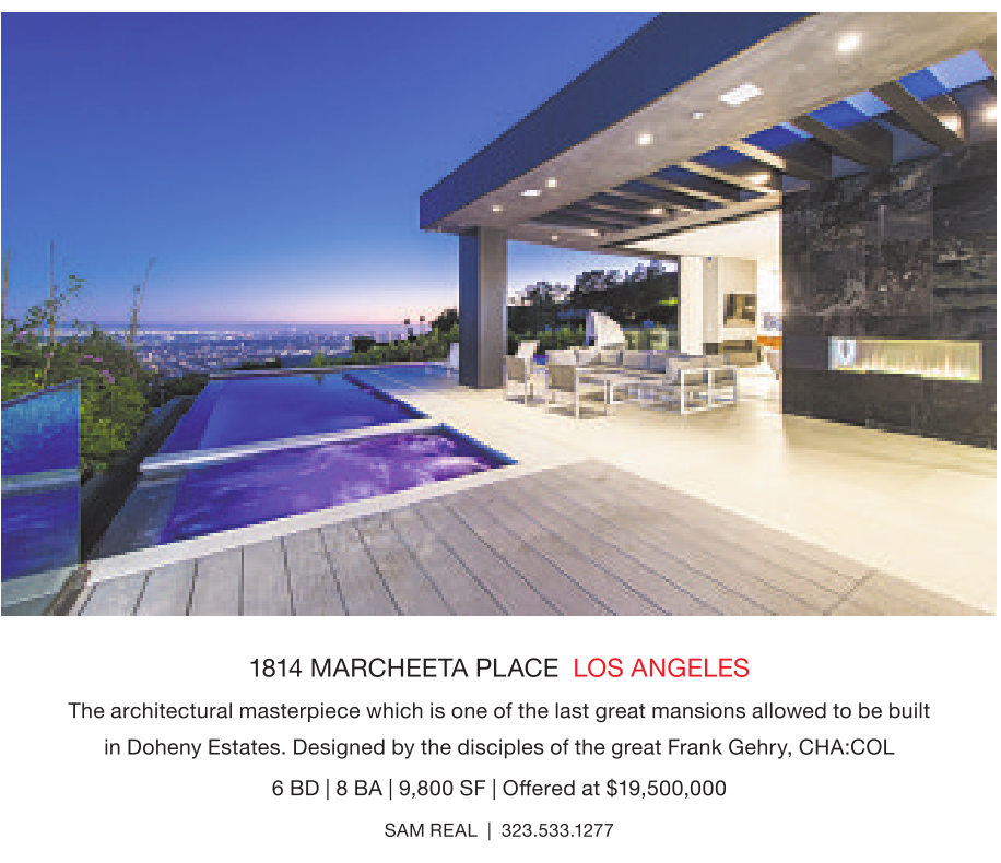 1814 MARCHEETA PLACE LOS ANGELES The architectural masterpiece which is one ofthe last great mansions allowed to be built in Doheny Estates. Designed bythe disciples ofthe great Frank Gehry, CHA:COL 6BD|8BA |9,800 SF |Offered at $19,500,000