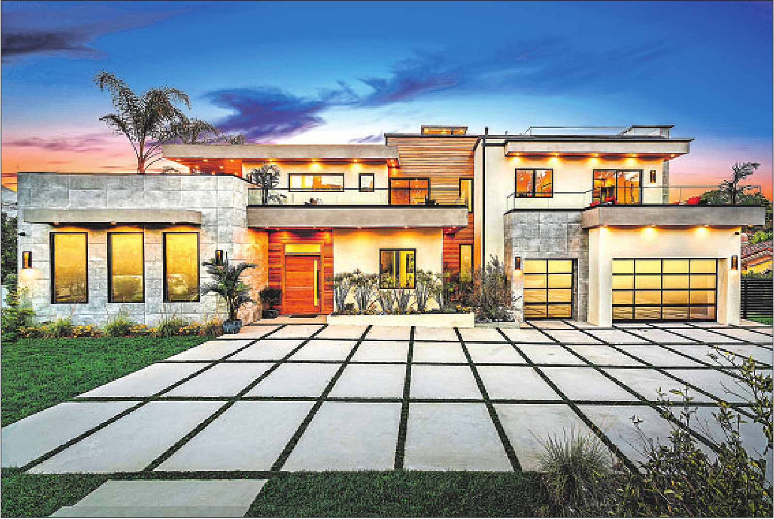 Features: Vaulted ceilings; marble, stone and wood finishes; modern fixtures; pocketing glass doors; grand foyer; chef’s kitchen with two islands; elevator; guest house; 3,000-square-foot rooftop deck; three-car garage with lift; zero-edge swimming pool and spa