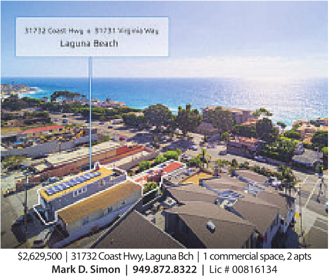 $2,629,500 | 31732 Coast Hwy, Laguna Bch | 1commercial space, 2apts Mark D. Simon | 949.872.8322 | Lic #00816134