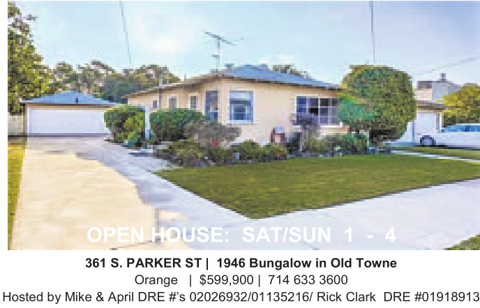 361 S. PARKER ST | 1946 Bungalow inOld Towne Orange | $599,900 | 714 633 3600 Hosted by Mike &April DRE #’s 02026932/01135216/ Rick Clark DRE #01918913