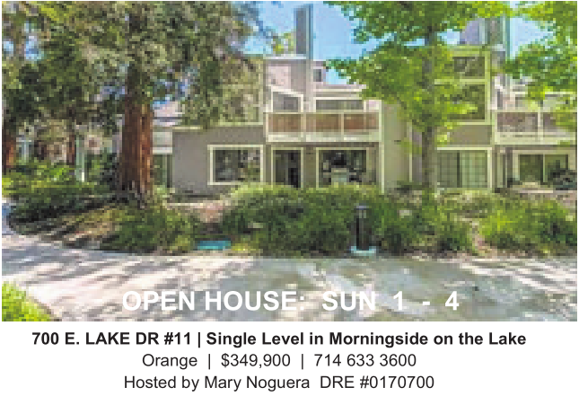 700 E. LAKE DR #11 |Single Level in Morningside onthe Lake Orange | $349,900 | 714 633 3600 Hosted by Mary Noguera DRE #0170700