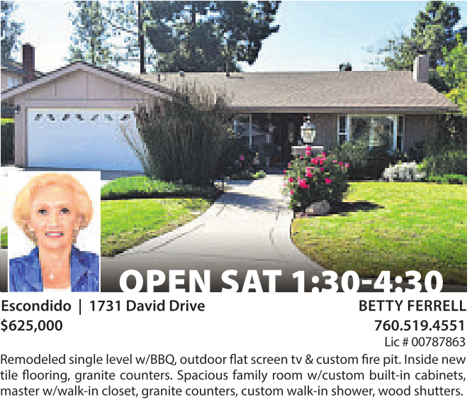 Escondido | 1731 David Drive BETTY FERRELL $625,000 760.519.4551 Lic #00787863 OPEN SAT 1:30-4:30 Remodeled single level w/BBQ,outdoor flat screen tv &custom fire pit. Inside new tile flooring, granite counters. Spacious family room w/custom built-in cabinets, master w/walk-in closet, granitecounters,custom walk-in shower, wood shutters.