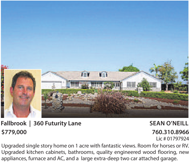 Fallbrook | 360 FuturityLane SEAN O’NEILL $779,000 760.310.8966 Lic #01797924 Upgraded single storyhomeon1acrewith fantastic views. Room forhorses or RV. Upgraded kitchen cabinets, bathrooms, quality engineered wood flooring, new appliances,furnace and AC,and a large extra-deep twocar attached garage.