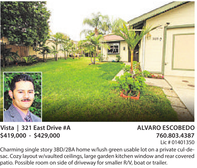 Vista | 321 East Drive#A ALVARO ESCOBEDO $419,000 - $429,000 760.803.4387 Lic #01401350 Charming single story3BD/2BA home w/lush green usable lot on aprivatecul-desac.Cozylayout w/vaultedceilings,large garden kitchen windowand rear covered patio.Possible room on side of drivewayfor smaller R/V,boatortrailer.