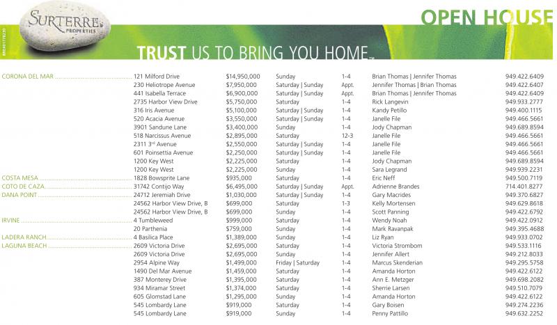CORONA DEL MAR ............................................. 121 Milford Drive $14,950,000 Sunday 1-4 Brian Thomas | Jennifer Thomas 949.422.6409 230 Heliotrope Avenue $7,950,000 Saturday | Sunday Appt. Jennifer Thomas | Brian Thomas 949.422.6407 441 Isabella Terrace $6,900,000 Saturday | Sunday Appt. Brian Thomas | Jennifer Thomas 949.422.6409 2735 Harbor View Drive $5,750,000 Saturday 1-4 Rick Langevin 949.933.2777 316 Iris Avenue $5,100,000 Saturday | Sunday 1-4 Kandy Petillo 949.400.1115 520 Acacia Avenue $3,550,000 Saturday | Sunday 1-4 Janelle File 949.466.5661 3901 Sandune Lane $3,400,000 Sunday 1-4 Jody Chapman 949.689.8594 518 Narcissus Avenue $2,895,000 Saturday 12-3 Janelle File 949.466.5661 2311 3 rd Avenue $2,550,000 Saturday | Sunday 1-4 Janelle File 949.466.5661 601 Poinsettia Avenue $2,250,000 Saturday | Sunday 1-4 Janelle File 949.466.5661 1200 Key West $2,225,000 Saturday 1-4 Jody Chapman 949.689.8594 1200 Key West $2,225,000 Sunday 1-4 Sara Legrand 949.939.2231 COSTA MESA ...................................................... 1828 Bowsprite Lane $935,000 Saturday 1-4 Eric Neff 949.500.7119 COTO DE CAZA................................................... 31742 Contijo Way $6,495,000 Saturday | Sunday Appt. Adrienne Brandes 714.401.8277 DANA POINT....................................................... 24712 Jeremiah Drive $1,030,000 Saturday | Sunday 1-4 Gary Macrides 949.370.6827 24562 Harbor View Drive, B $699,000 Saturday 1-3 Kelly Mortensen 949.629.8618 24562 Harbor View Drive, B $699,000 Sunday 1-4 Scott Panning 949.422.6792 IRVINE ................................................................. 4 Tumbleweed $999,000 Saturday 1-4 Wendy Noah 949.422.0912 20 Parthenia $759,000 Sunday 1-4 Mark Ravanpak 949.395.4688 LADERA RANCH.................................................. 4 Basilica Place $1,389,000 Sunday 1-4 Liz Ryan 949.933.0702 LAGUNA BEACH................................................. 2609 Victoria Drive $2,695,000 Saturday 1-4 Victoria Strombom 949.533.1116 2609 Victoria Drive $2,695,000 Sunday 1-4 Jennifer Allert 949.212.8033 2954 Alpine Way $1,499,000 Friday | Saturday 1-4 Marcus Skenderian 949.295.5758 1490 Del Mar Avenue $1,459,000 Saturday 1-4 Amanda Horton 949.422.6122 387 Monterey Drive $1,395,000 Saturday 1-4 Ann E. Metzger 949.698.2082 934 Miramar Street $1,374,000 Saturday 1-4 Sherrie Larsen 949.510.7079 605 Glomstad Lane $1,295,000 Sunday 1-4 Amanda Horton 949.422.6122 545 Lombardy Lane $919,000 Saturday 1-4 Gary Boisen 949.274.2236 545 Lombardy Lane $919,000 Sunday 1-4 Penny Pattillo 949.632.2252