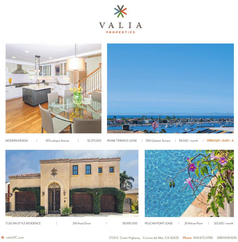 MODERN DESIGN | 613 Larkspur Avenue | $2,375,000 IRVINE TERRACE LEASE | 1915 Galatea Terrace | $9,500 /month | OPEN SAT+SUN 1-4 TUSCAN STYLE RESIDENCE | 218 Hazel Drive | $9,995,000 PELICAN POINT LEASE | 26 Pelican Point | $21,500 /month valiaOC.com 2720 E. Coast Highway, Corona del Mar, CA 92625 Phone 949.673.0789 DRE#01911636