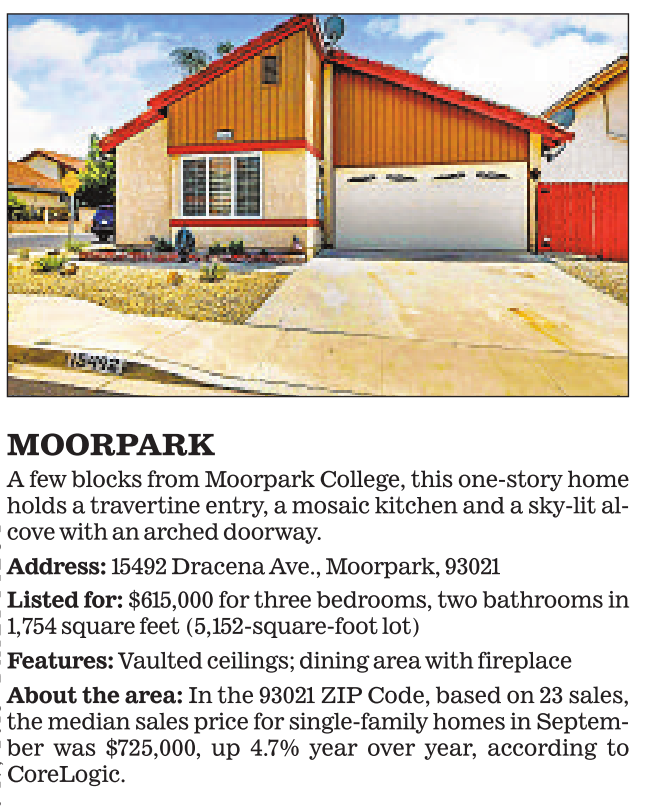 About the area: In the 93021 ZIP Code, based on 23 sales, the median sales price for single-family homes in September was $725,000, up 4.7% year over year, according to CoreLogic.