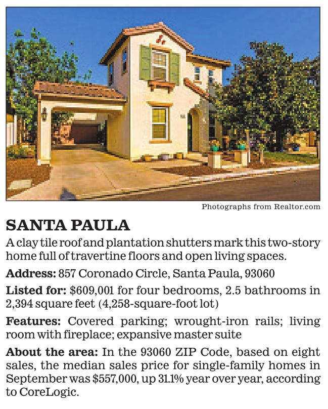 About the area: In the 93060 ZIP Code, based on eight sales, the median sales price for single-family homes in September was $557,000, up 31.1% year over year, according to CoreLogic.