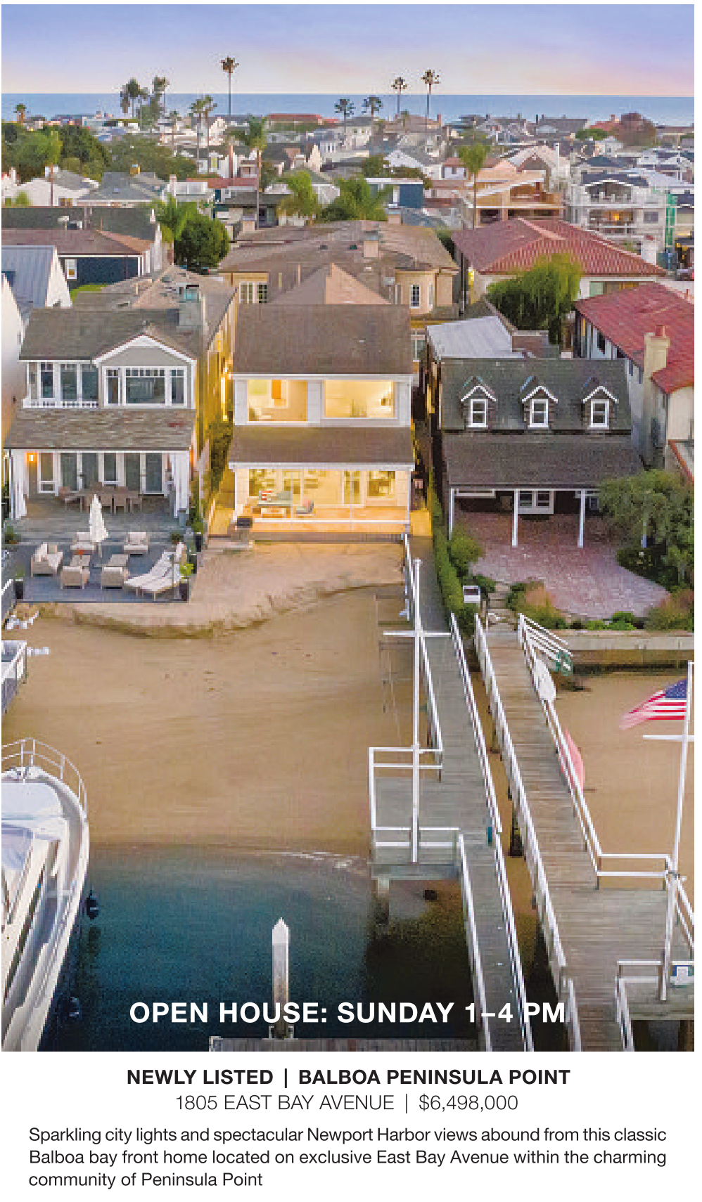 OPEN HOUSE: SUNDAY 1–4 PM NEWLY LISTED | BALBOA PENINSULA POINT 1805 EAST BAY AVENUE | $6,498,000 Sparkling citylightsand spectacular Newport Harbor views abound from this classic Balboa bay front home located on exclusive East Bay Avenue within the charming community of Peninsula Point