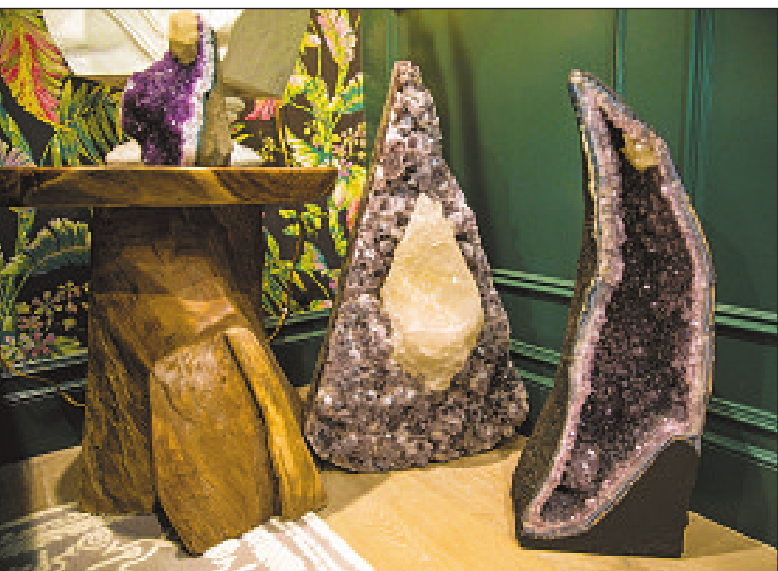 There’s the iridescent angel aura quartz reminiscent of a broken arrowhead, the aquamarine with “calming and cooling energy,” the orange citrine for creativity, and celestite in a rare shade of light blue. But the giant amethyst, its large fissure crowded with deep-purple calcite crystals, is his favorite.