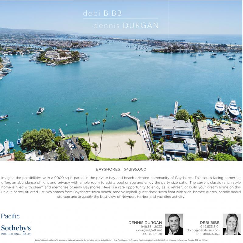 d e b i B I B B d e n n i s D U R G A N BAYSHORES | $4,995,000 Imagine the possibilities with a 9000 sq ft parcel in the private bay and beach oriented community of Bayshores. This south facing corner lot offers an abundance of light and privacy with ample room to add a pool or spa and enjoy the party size patio. The current classic ranch style home is filled with charm and memories of early Bayshores. Here is a rare opportunity to enjoy as is, refresh, or build your dream home on this unique parcel situated just two homes from Bayshores swim beach, sand volleyball, guest dock, swim float with slide, barbecue area, paddle board storage and arguably the best view of Newport Harbor and yachting activity. DENNIS DURGAN 949.554.2033 ddurgan@att.net DRE #01173130 DEBI BIBB 949.533.5101 dbibb@pacificsir.com DRE #00602463 Sotheby’s International Realty ® is aregistered trademark licensed to Sotheby’s International Realty Affiliates LLC. AnEqual OpportunityCompany. Equal Housing Opportunity. Each Office is IndependentlyOwned And Operated. DRE #01767484