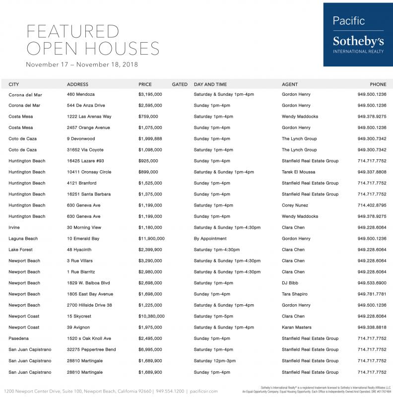 Newport Beach 2700 Hillside Drive 38 $1,225,000 Saturday & Sunday 1pm-4pm Gordon Henry 949.500.1236