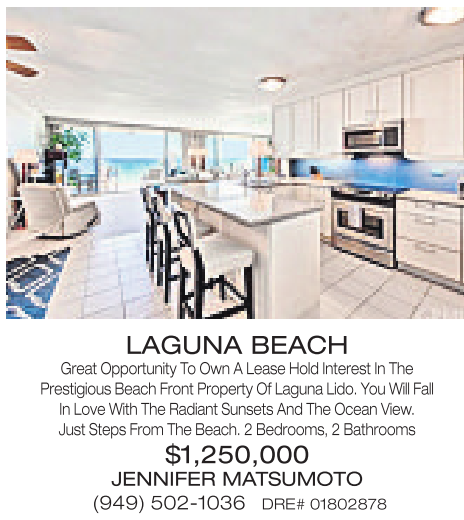 Prestigious Beach Front Property Of Laguna Lido. YouWill Fall In Love With The Radiant Sunsets And The Ocean View. Just Steps From The Beach. 2Bedrooms, 2Bathrooms $1,250,000 JENNIFER MATSUMOTO (949) 502-1036 DRE# 01802878