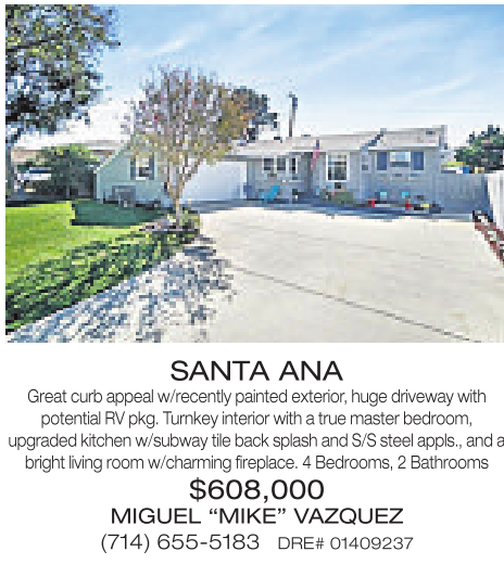 potential RV pkg. Turnkey interior with atrue master bedroom, upgraded kitchen w/subway tile back splash and S/S steel appls., and a bright living room w/charming fireplace. 4Bedrooms, 2Bathrooms $608,000 MIGUEL “MIKE” VAZQUEZ (714) 655-5183 DRE# 01409237