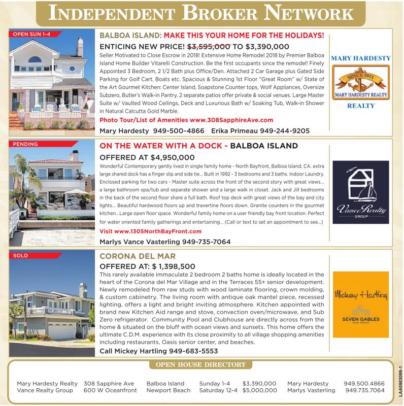 Mary Hardesty Realty 308 Sapphire Ave Balboa Island Sunday 1-4 $3,390,000 Mary Hardesty 949.500.4866 Vance Realty Group 600 W Oceanfront Newport Beach Saturday 12-4 $5,000,000 Marlys Vasterling 949.735.7064