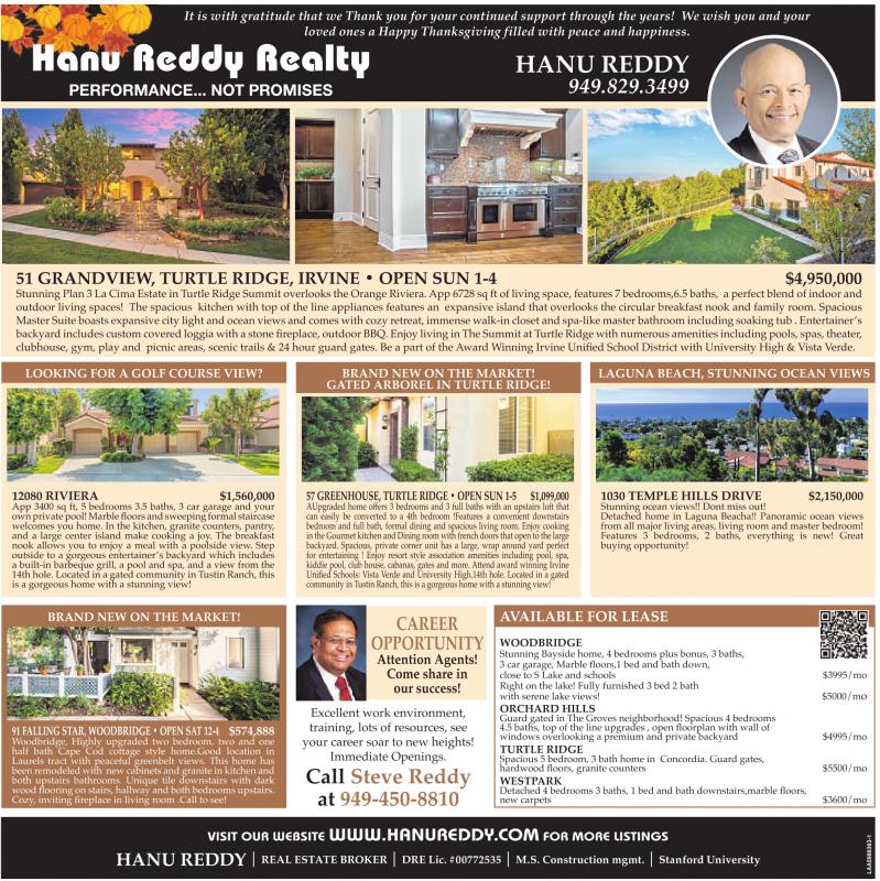 12080 RIVIERA $1,560,000 App 3400 sq ft, 5 bedrooms 3.5 baths, 3 car garage and your own private pool! Marble floors and sweeping formal staircase welcomes you home. In the kitchen, granite counters, pantry, and a large center island make cooking a joy. The breakfast nook allows you to enjoy a meal with a poolside view. Step outside to a gorgeous entertainer’s backyard which includes a built-in barbeque grill, a pool and spa, and a view from the 14th hole. Located in agated community in Tustin Ranch, this is agorgeous home with astunning view!