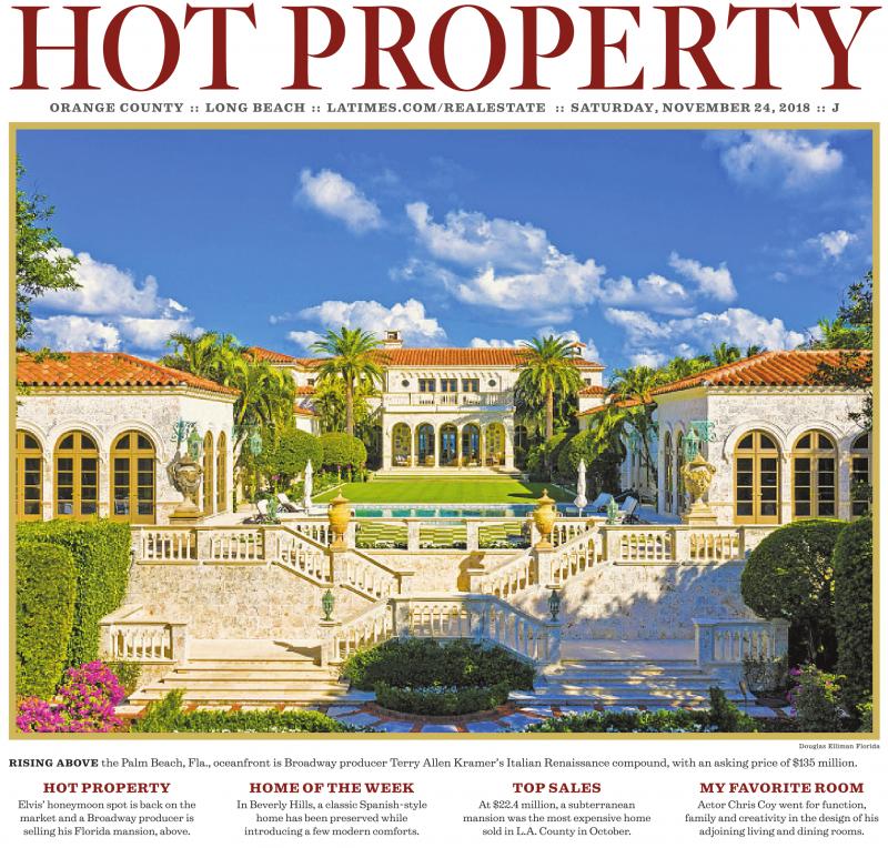 HOT PROPERT Y ORANGE COUNTY :: LONG BEACH :: LATIMES.COM/REALESTATE :: SATURDAY, NOVEMBER 24, 2018 :: J Douglas Elliman Florida RISING ABOVE the Palm Beach, Fla., oceanfront is Broadway producer Terry Allen Kramer’s Italian Renaissance compound, with an asking price of $135 million. HOT PROPERTY Elvis’ honeymoon spot is back on the market and a Broadway producer is selling his Florida mansion, above. HOME OF THE WEEK In Beverly Hills, a classic Spanish-style home has been preserved while introducing a few modern comforts. TOP SALES At $22.4 million, a subterranean mansion was the most expensive home sold in L.A. County in October. MY FAVORITE ROOM Actor Chris Coy went for function, family and creativity in the design of his adjoining living and dining rooms.