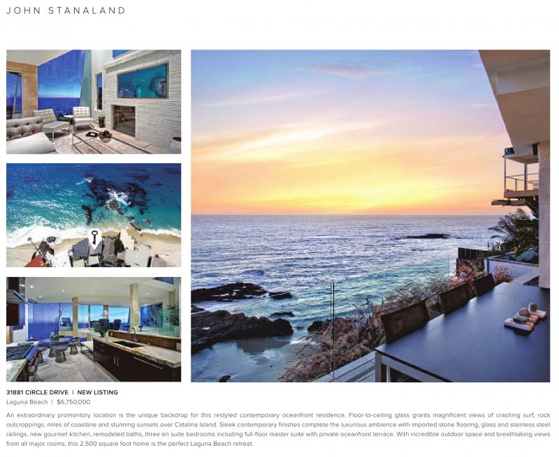 An extraordinary promontory location is the unique backdrop for this restyled contemporary oceanfront residence. Floor-to-ceiling glass grants magnificent views of crashing surf, rock outcroppings, miles of coastline and stunning sunsets over Catalina Island. Sleek contemporary finishes complete the luxurious ambience with imported stone flooring, glass and stainless steel railings, new gourmet kitchen, remodeled baths, three en suite bedrooms including full-floor master suite with private oceanfront terrace. With incredible outdoor space and breathtaking views from all major rooms, this 2,500 square foot home is the perfect Laguna Beach retreat.