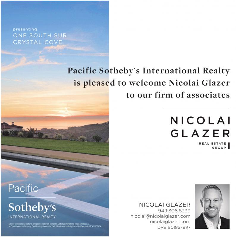 presenting ONE SOUTH SUR CRYSTAL COVE Pacific Sotheby's International Realty is pleased to welcome Nicolai Glazer to our firm of associates Sotheby’s InternationalRealty ® is aregisteredtrademark licensed to Sotheby’sInternational Realty Affiliates LLC. An Equal Opportunity Company. Equal Housing Opportunity. Each OfficeisIndependentlyOwned AndOperated.DRE #01767484 NICOLAI GLAZER 949.306.8339 nicolai@nicolaiglazer.com nicolaiglazer.com DRE #01857997
