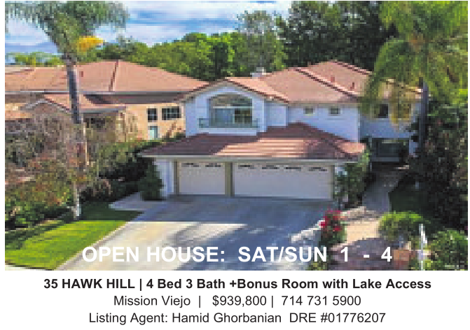 35 HAWK HILL |4Bed 3Bath +Bonus Room with Lake Access Mission Viejo | $939,800 | 714 731 5900 Listing Agent: Hamid Ghorbanian DRE #01776207