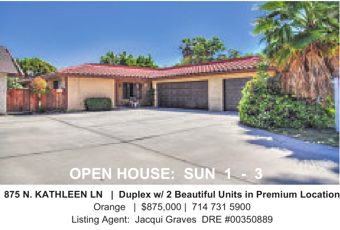 875 N. KATHLEEN LN | Duplex w/2Beautiful Units in Premium Location Orange | $875,000 | 714 731 5900 Listing Agent: Jacqui Graves DRE #00350889