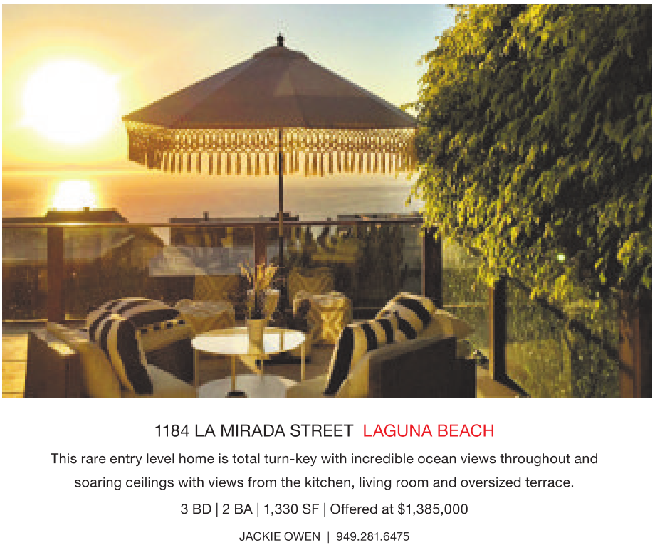 1184 LA MIRADA STREET LAGUNA BEACH This rare entry level home istotal turn-key with incredible ocean views throughout and soaring ceilings with views from the kitchen, living room and oversized terrace. 3BD|2BA |1,330 SF |Offered at $1,385,000 JACKIE OWEN | 949.281.6475
