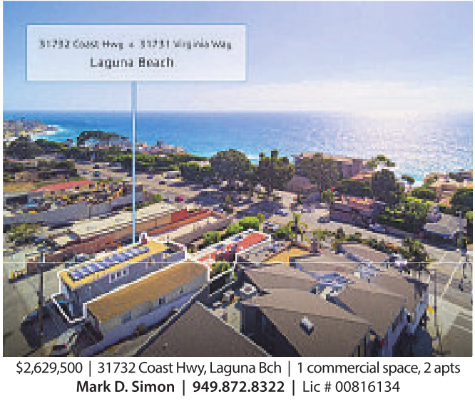 $2,629,500 | 31732 Coast Hwy, Laguna Bch | 1commercial space, 2apts Mark D. Simon | 949.872.8322 | Lic #00816134