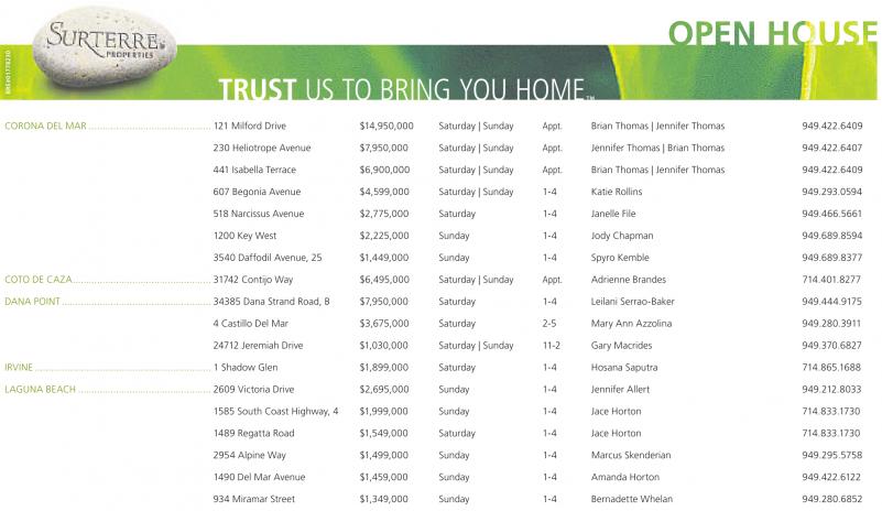 IRVINE ................................................................. 1 Shadow Glen $1,899,000 Saturday 1-4 Hosana Saputra 714.865.1688 LAGUNA BEACH................................................. 2609 Victoria Drive $2,695,000 Sunday 1-4 Jennifer Allert 949.212.8033 1585 South Coast Highway, 4 $1,999,000 Sunday 1-4 Jace Horton 714.833.1730 1489 Regatta Road $1,549,000 Saturday 1-4 Jace Horton 714.833.1730 2954 Alpine Way $1,499,000 Sunday 1-4 Marcus Skenderian 949.295.5758 1490 Del Mar Avenue $1,459,000 Sunday 1-4 Amanda Horton 949.422.6122 934 Miramar Street $1,349,000 Sunday 1-4 Bernadette Whelan 949.280.6852