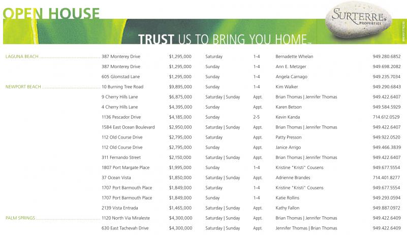 LAGUNA BEACH................................................. 387 Monterey Drive $1,295,000 Saturday 1-4 Bernadette Whelan 949.280.6852 387 Monterey Drive $1,295,000 Sunday 1-4 Ann E. Metzger 949.698.2082 605 Glomstad Lane $1,295,000 Sunday 1-4 Angela Carnago 949.235.7034 NEWPORT BEACH............................................... 10 Burning Tree Road $9,895,000 Sunday 1-4 Kim Walker 949.290.6843 9 Cherry Hills Lane $6,875,000 Saturday | Sunday Appt. Brian Thomas | Jennifer Thomas 949.422.6407 4 Cherry Hills Lane $4,395,000 Sunday Appt. Karen Betson 949.584.5929 1136 Pescador Drive $4,185,000 Sunday 2-5 Kevin Kanda 714.612.0529 1584 East Ocean Boulevard $2,950,000 Saturday | Sunday Appt. Brian Thomas | Jennifer Thomas 949.422.6407 112 Old Course Drive $2,795,000 Saturday Appt. Patty Presson 949.922.0520 112 Old Course Drive $2,795,000 Sunday Appt. Janice Arrigo 949.466.3839 311 Fernando Street $2,150,000 Saturday | Sunday Appt. Brian Thomas | Jennifer Thomas 949.422.6407 1807 Port Margate Place $1,995,000 Sunday 1-4 Kristine "Kristi" Cousens 949.677.5554 37 Ocean Vista $1,850,000 Saturday | Sunday Appt. Adrienne Brandes 714.401.8277 1707 Port Barmouth Place $1,849,000 Saturday 1-4 Kristine "Kristi" Cousens 949.677.5554 1707 Port Barmouth Place $1,849,000 Sunday 1-4 Katie Rollins 949.293.0594 2139 Vista Entrada $1,465,000 Saturday | Sunday Appt. Kathy Fallon 949.887.0972 PALM SPRINGS.................................................... 1120 North Via Miraleste $4,300,000 Saturday | Sunday Appt. Brian Thomas | Jennifer Thomas 949.422.6409 630 East Tachevah Drive $4,300,000 Saturday | Sunday Appt. Jennifer Thomas | Brian Thomas 949.422.6409