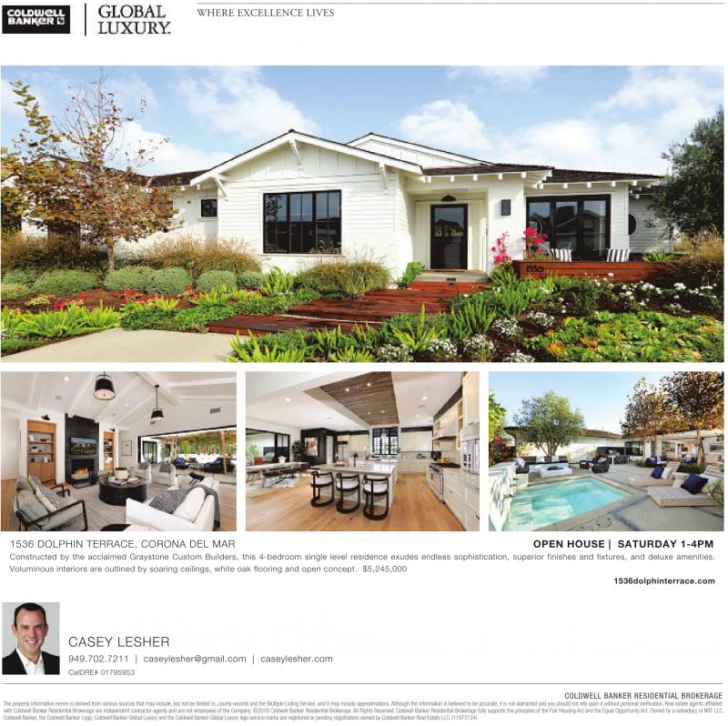 1536 DOLPHIN TERRACE, CORONA DEL MAR OPEN HOUSE | SATURDAY 1-4PM Constructed by the acclaimed Graystone Custom Builders, this 4-bedroom single level residence exudes endless sophistication, superior finishes and fixtures, and deluxe amenities.