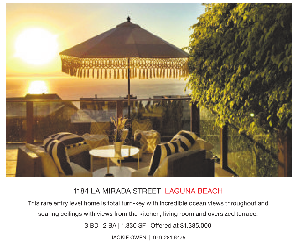 1184 LA MIRADA STREET LAGUNA BEACH This rare entry level home istotal turn-key with incredible ocean views throughout and soaring ceilings with views from the kitchen, living room and oversized terrace. 3BD|2BA |1,330 SF |Offered at $1,385,000 JACKIE OWEN | 949.281.6475