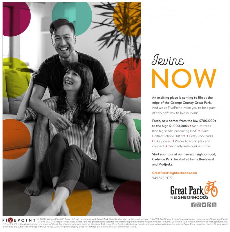 Irvine NOW An exciting place is coming to life at the edge of the Orange County Great Park. And we at FivePoint invite you to be a part of this new way to live in Irvine. Fresh, new homes from the low $700,000s to the high $1,000,000s (the big shade-producing kind) Unified School District Bike power! connect Mature trees Irvine Crazy cool parks Places to work, play and Decidedly anti-cookie-cutter Start your tour at our newest neighborhood, Cadence Park, located at Irvine Boulevard and Modjeska. GreatParkNeighborhoods.com 949.523.2077 ©2018 Heritage Fields El Toro, LLC. All rights reserved. Great Park Neighborhoods, the bicycle logo, and “Life Will Be Different Here” are registered trademarks ofHeritage Fields El Toro, LLC (“Heritage Fields”) dba Great Park Neighborhoods used for the marketing ofnew home neighborhoods in Irvine, California. Five Point Communities Management, Inc. (“Five Point”) is the development manager of Great Park Neighborhoods. Neither Heritage Fields nor Five Point is designing, constructing or offering homes for sale in Great Park Neighborhoods. All proposed amenities are subject tochange without notice. Lifestyle photography does not reflect any ethnic or racial preference. (11/18)