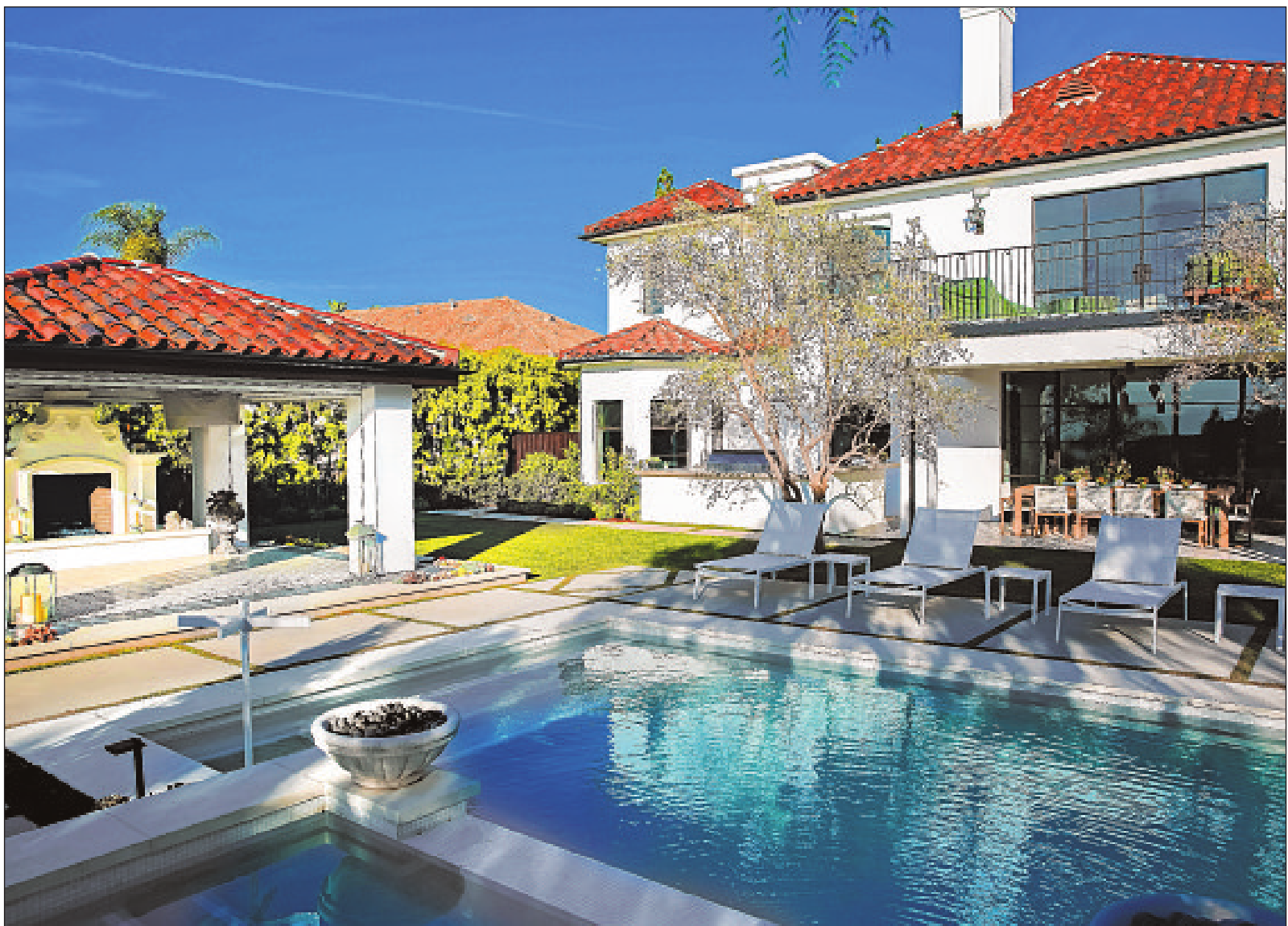 Crucial to the project, the façade and front rooflines had to be reworked. The new white plaster exterior, the barrel tile roofing and black metal divided-light windows all serve up the Mission style Cynthia wanted. The house that she said “screamed for an entryway” got a fountain surrounded by tile decking, set in front of wide glass front doors, flanked by gas-lit sconces.