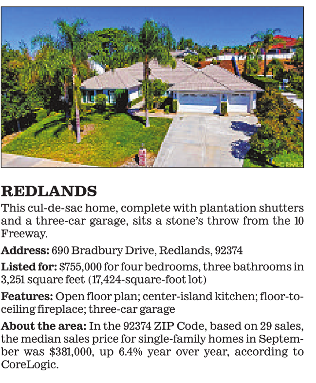 REDLANDS This cul-de-sac home, complete with plantation shutters and a three-car garage, sits a stone’s throw from the 10 Freeway. Address: 690 Bradbury Drive, Redlands, 92374 Listed for: $755,000 for four bedrooms, three bathrooms in 3,251 square feet (17,424-square-foot lot) Features: Open floor plan; center-island kitchen; floor-toceiling fireplace; three-car garage About the area: In the 92374 ZIP Code, based on 29 sales, the median sales price for single-family homes in September was $381,000, up 6.4% year over year, according to CoreLogic. See also