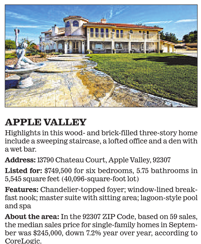 APPLE VALLEY Highlights in this wood- and brick-filled three-story home include a sweeping staircase, a lofted office and a den with awet bar. Address: 13790 Chateau Court, Apple Valley, 92307 Listed for: $749,500 for six bedrooms, 5.75 bathrooms in 5,545 square feet (40,096-square-foot lot) Features: Chandelier-topped foyer; window-lined breakfast nook; master suite with sitting area; lagoon-style pool and spa About the area: In the 92307 ZIP Code, based on 59 sales, the median sales price for single-family homes in September was $245,000, down 7.2% year over year, according to CoreLogic. See also