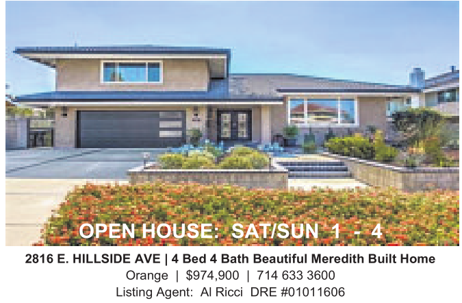 2816 E. HILLSIDE AVE |4Bed 4Bath Beautiful Meredith Built Home Orange | $974,900 | 714 633 3600 Listing Agent: AlRicci DRE #01011606